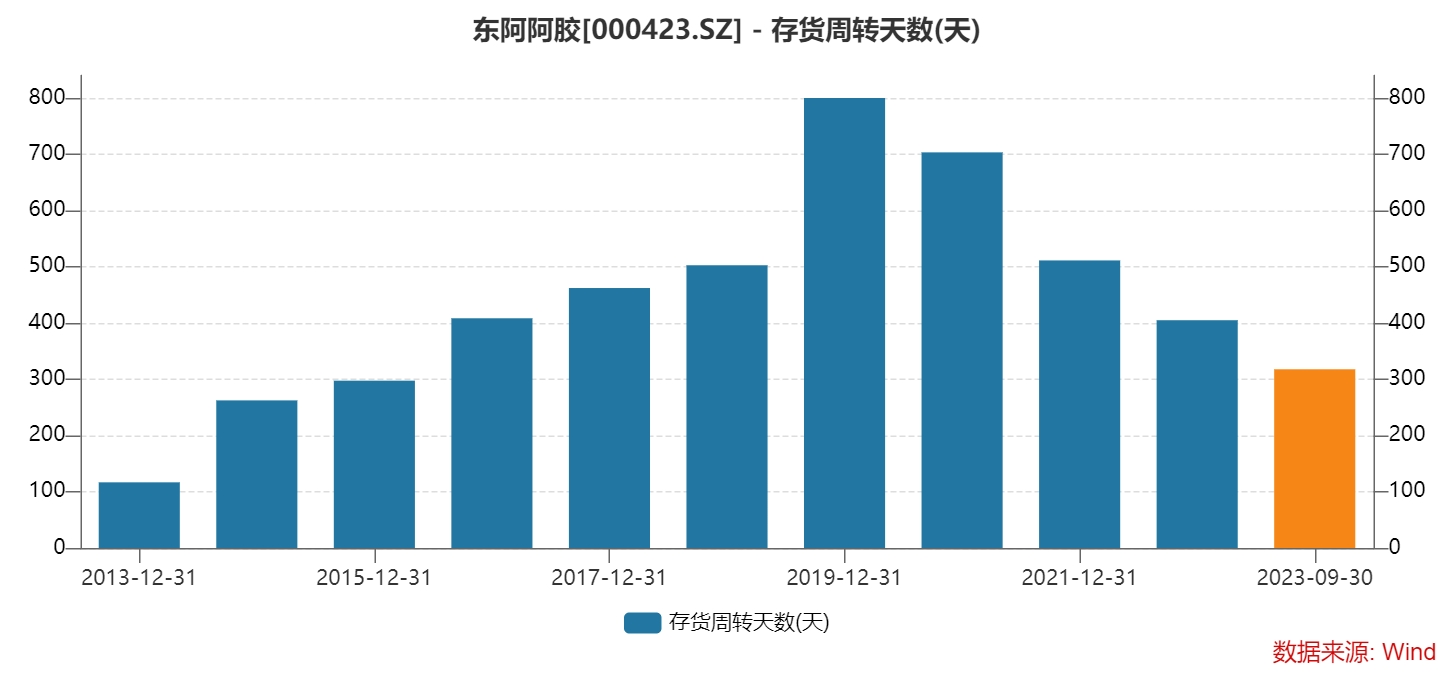 东阿阿胶存货周转天数最高是2019年的800.53天,过去3年持续下降到去年的405.22天。今年前三季度,东阿阿胶的存货周转天数进一步下降到317.95天,纵向比已经回到了2015年的水平。