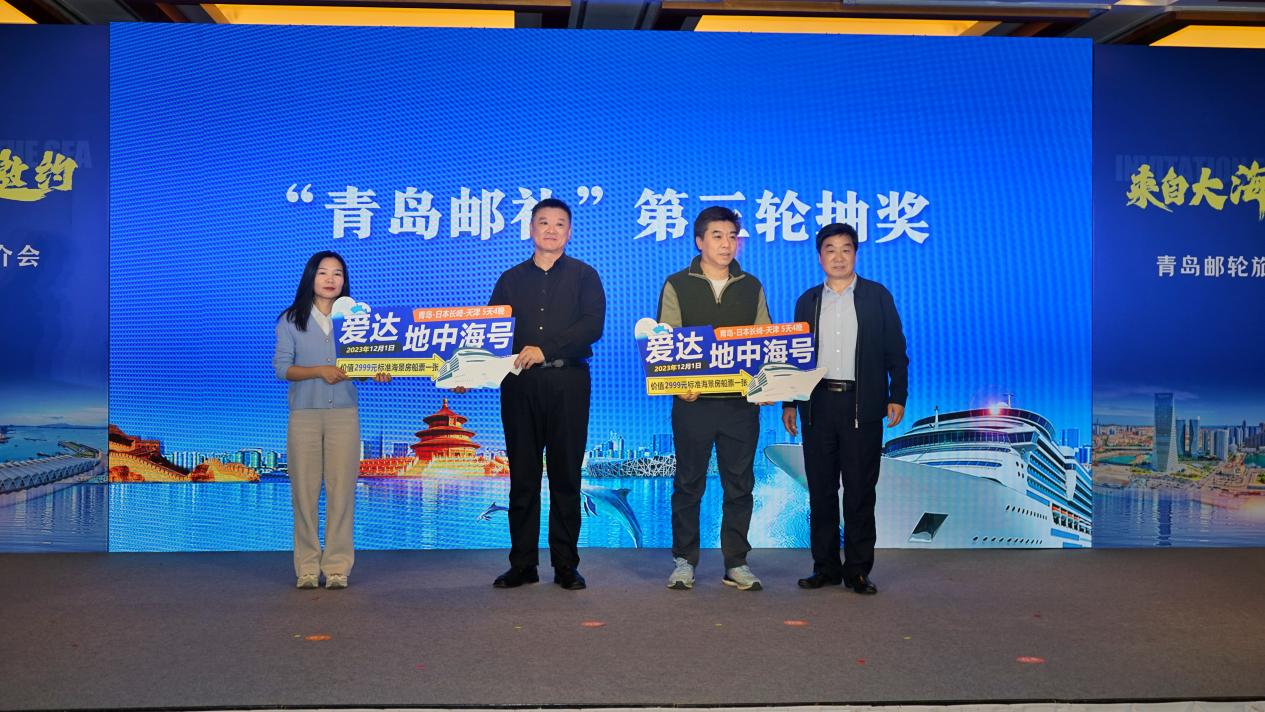 本次推介会上还进行了三轮“青岛邮礼”抽奖活动,青岛市政府办公厅二级巡视员杨茂文,北京市文化和旅游局一级调研员段荣印,中交水运规划设计院安监部总经理赵有明,青岛市公安局港航分局党委委员、纪委书记马延武,各抽取12月1日“地中海号”邮轮海景房船票1张,4名嘉宾将免费享受海上观光的新奇体验。