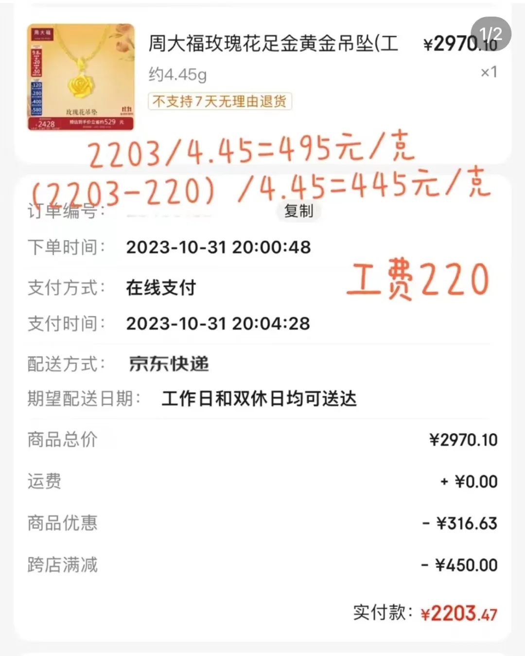 Emily在某官方旗舰店选择了两款金饰,一个玫瑰花足金吊坠是她最想要的,另一个是为凑够3800减300的活动。付款成功后,她又把原本不需要的那个耳环退掉。最后,她用2203元就抢到了4.45克的黄金吊坠,扣除工费220元,每克黄金价值445元。