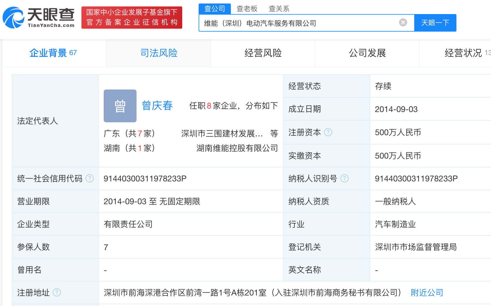 从变更记录可以看出,后两者注册资本的提升,主要来自于这家维能(深圳)电动汽车服务限公司投资人。该公司正是前述参保人员为7人的公司,注册资本500万元,实缴资本500万元。