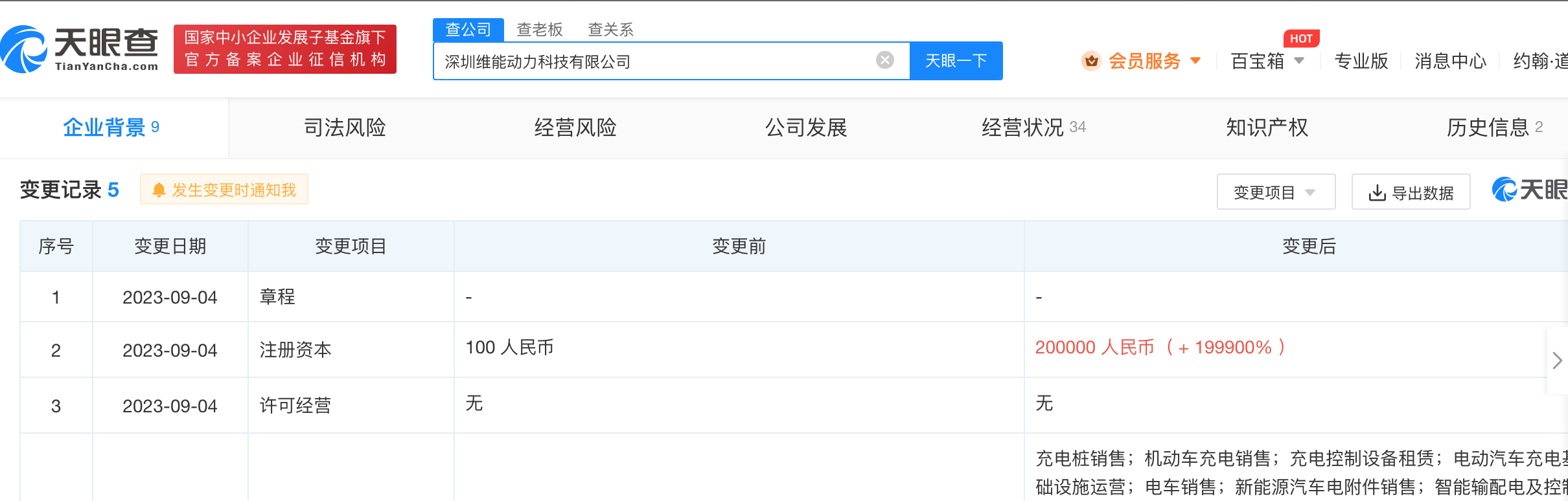 进一步看变更记录,注册资本20亿元的深圳维能动力科技有限公司,实际上是2023年9月4日才从100元变更为20亿元的,变更幅度199900%。