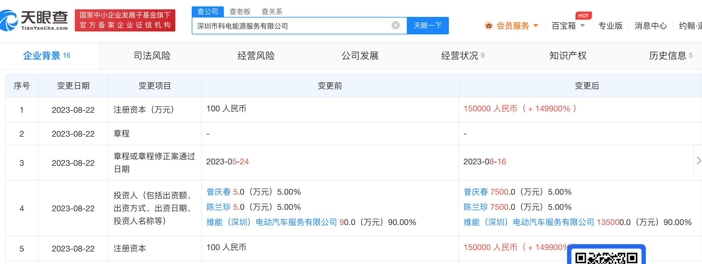 注册资本为15亿元的深圳市科电能源服务有限公司,变更记录显示,其注册资本是2023年8月22日从100元变更为15亿元的,变更幅度149900%。