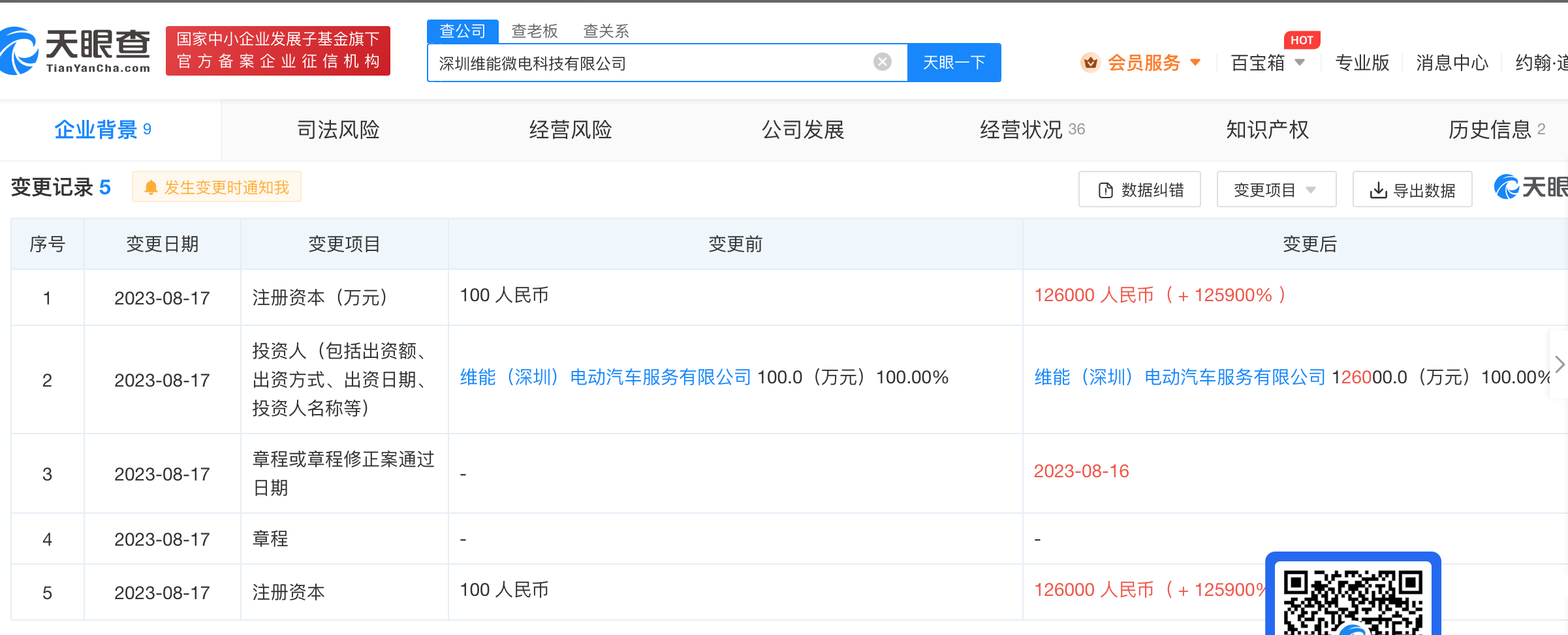 注册资本为12.6亿元的深圳维能微电科技有限公司,注册资本从100元变更为12.6亿元的时间是2023年8月17日,变更幅度125900%。