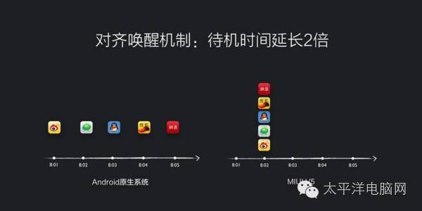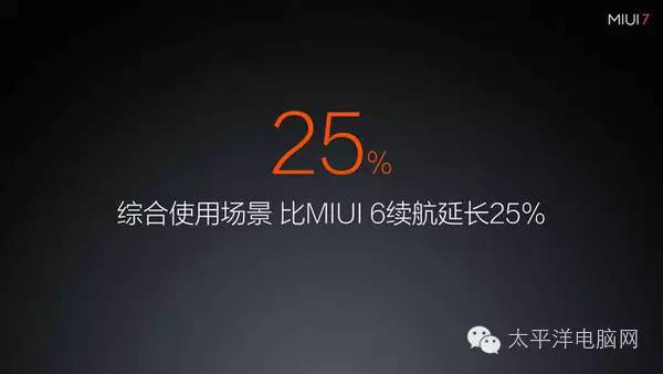 当初发布MIUI 7的时候,与之出现的还有MIUI的省电模式——对齐唤醒机制。雷军表示在这种省电机制下面,手机续航时间可以增加25%,待机时间至少增加三个小时。三个小时的待机时间对于一天一充的Andriod来说实在诱人。