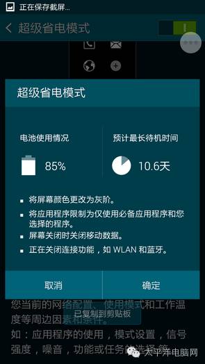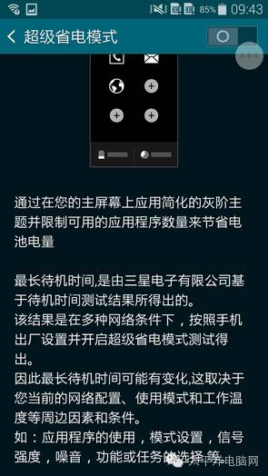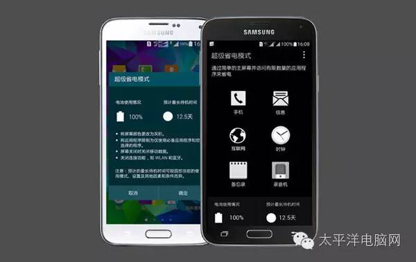 “超级省电模式”,该模式下屏幕的颜色会自动变成黑白,所有非必要的程序都会自动关闭,三星公司表示当手机剩余10%电量进入“超级省电模式”后最多还可以坚持使用24小时。为什么要把屏幕颜色调为黑白色呢?首先,黑白颜色的界面会降低对手机GPU的处理要求,功耗自然会降低。其次三星S5采用的是Super AMOLED材质屏幕,其一特性是当显示黑色时屏幕不发光,也就是在减少电量的消耗,这种特性是IPS材质所没有的。