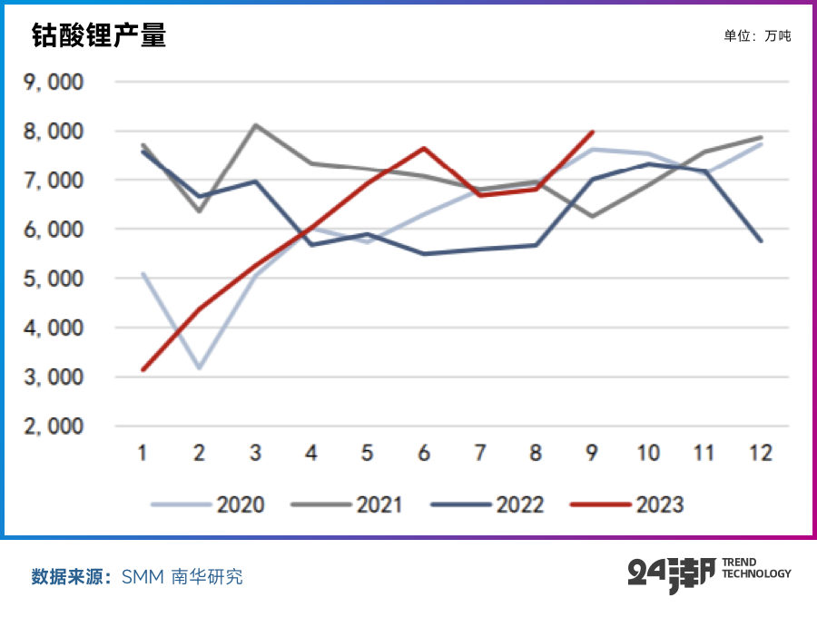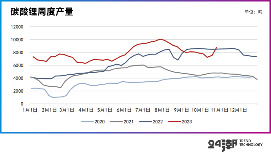 首先看碳酸锂供给变化。在国庆节前几家大冶炼厂宣布减产,试图扭转市场的悲观情绪,目前来看,效果有限。数据显示,2023年1-9月国内碳酸锂产量33.3万吨,累计同比增长36.9%,今年的锂盐总体供应仍然相对充足。