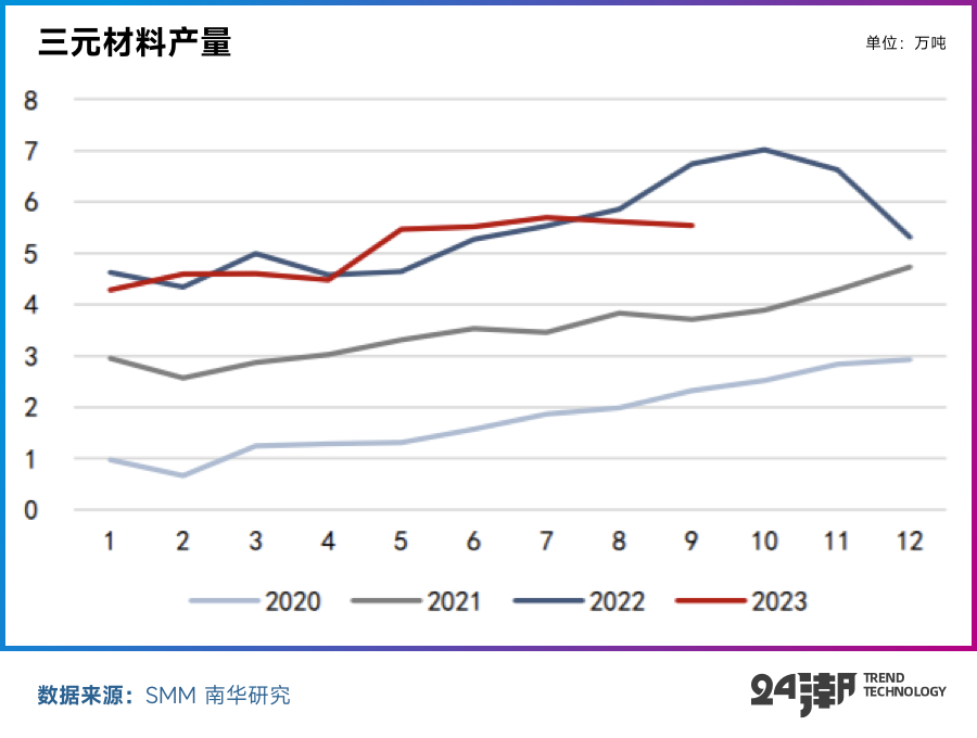 根据My steel的数据预测,11月电池厂排产预计环比下降8%,材料端根据初步调研,11月磷酸铁锂正极材料排产预计环比下降3%,三元正极材料排产预计环比下降5%,其中中镍三元及以下排产预计环比下降3%。四季度的下游需求仍不容乐观。
