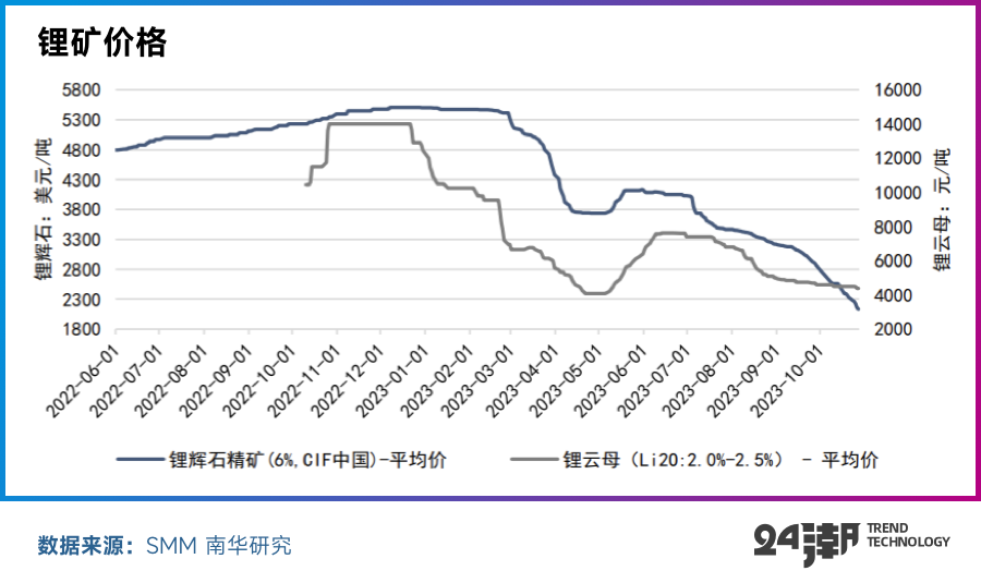 根据SMM数据,近期进口澳矿下跌速度较快,10月底海外主流网站中报价最高的fastmakets报1800-2000美元,矿山仍有盈利。大矿山经历过上一轮锂的行业周期,对于去库存的认知和动作较快,定价方式的转变,这不仅意味着盐厂成本下移,还体现了澳矿急于出货,矿端松动也必然导致锂矿的价格一路向下。