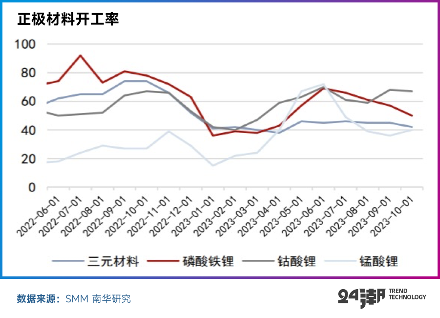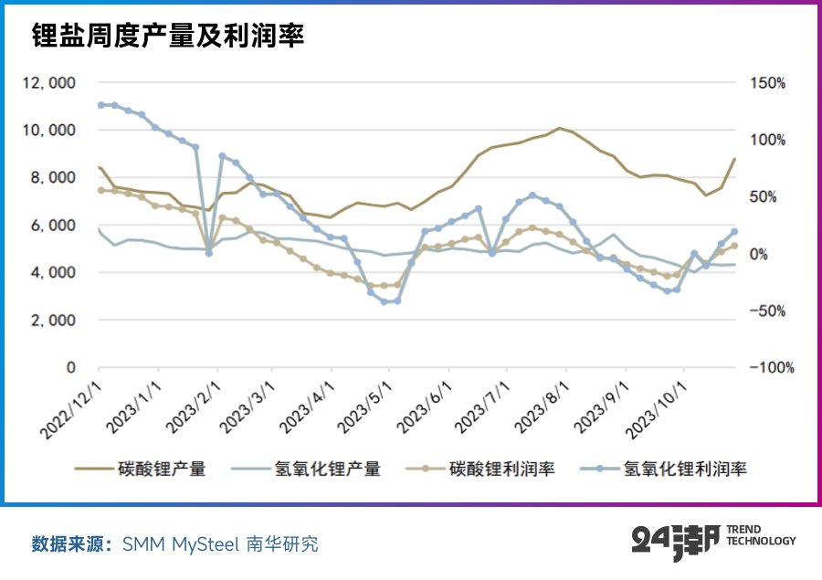 由于原料价格的下滑,利润回升让之前抱团减产的锂盐厂业已经开始逐步瓦解,有两家小厂已经在10月复产,还有部分产能预计在11月复产,碳酸锂产量已经开始回升。碳酸锂周度开工率由十月中旬低位48.2%回升至11月初58.37%。