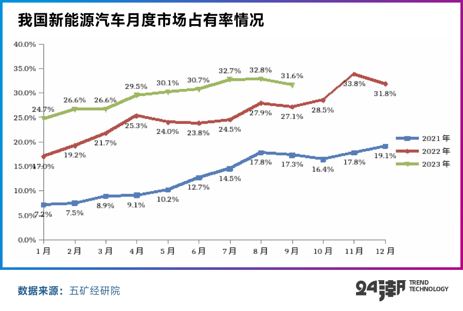 首先看新能源销售终端数据变化。我国新能源汽车市场增速已经出现进一步放缓趋势。根据中汽协发布的数据,三季度新能源汽车市场增速跌至30%以内。其中9月我国新能源汽车销量环比仅增长6.9%,低于同期汽车总销售量9.5%的增速,新能源汽车市场渗透率31.6%,环比下跌1.2个百分点。