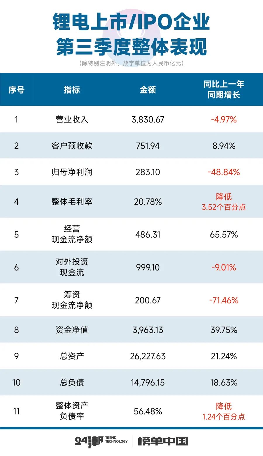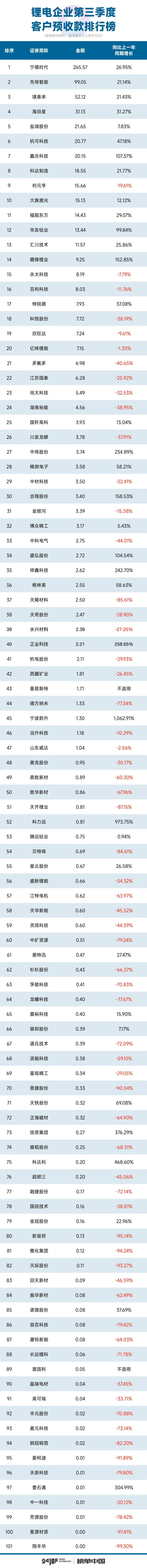 为了让读者朋友对锂电产业趋势与变化有一个更为清晰、直观的了解,24潮团队根据101家锂电上市/IPO公司最新财报(2023年第三季报)中营收、预收款、归母净利润、毛利率、对外投资、经营与筹资现金流、总资产与负债、资金实力等核心数据制作了十大排行榜。