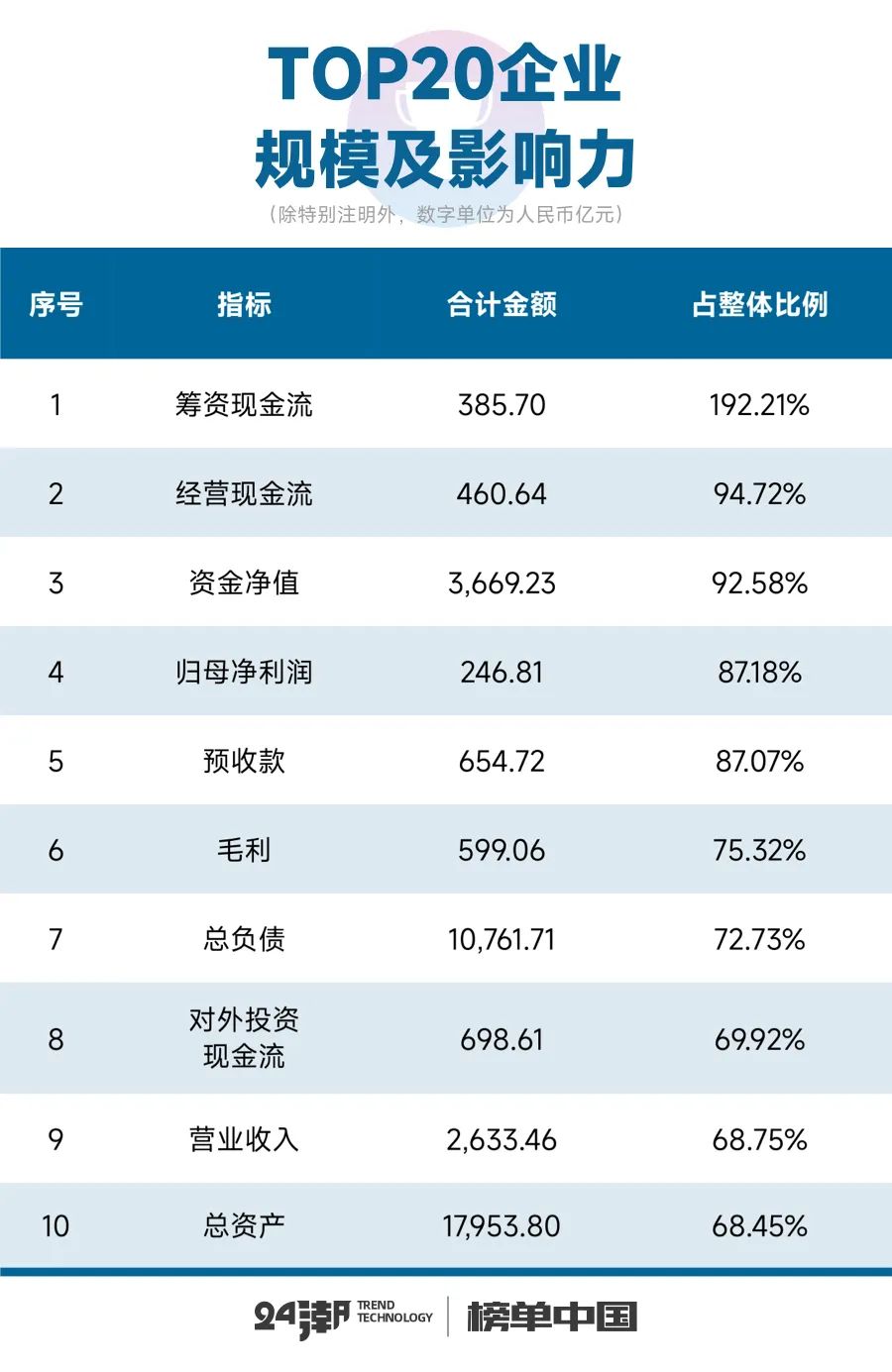 此外通过24潮统计数据可以清晰看到,在加速洗牌与博弈的产业趋势下,行业资源与利润正在加速向寡头聚集:比如十大排行榜中:营收TOP 20企业占整体比重达68.75%,预收款(合同负债)TOP 20企业占整体比重达87.07%,归母净利润TOP 20企业占整体比重达87.18%,经营现金流净额TOP 20企业占整体比重达94.72%,对外投资TOP 20企业占整体比重达69.92%,筹资净额TOP 20企业占整体比重达192.21%(部分企业净额为负),资金净值TOP20企业占整体比重达92.58%等。