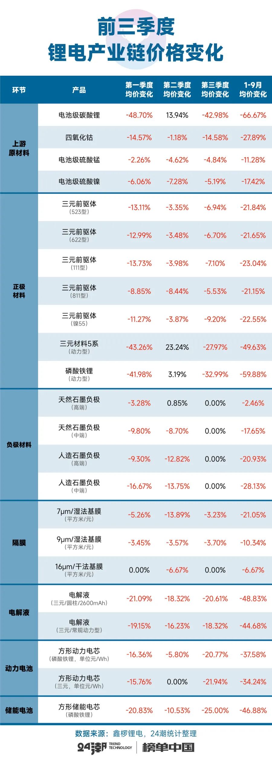 如下表所示,前三个季度中,作为锂电产业最重要的两大增长引擎 “动力与储能电池” 价格呈现加速下降趋势,仅第三季度(7-9月份)动力与储能电池价格环比第二季度下降超20%,前三个季度价格降幅超34%,其中储能电池价格爆降了46.88%,当前降价潮已传递整个锂电产业链,详见下表: