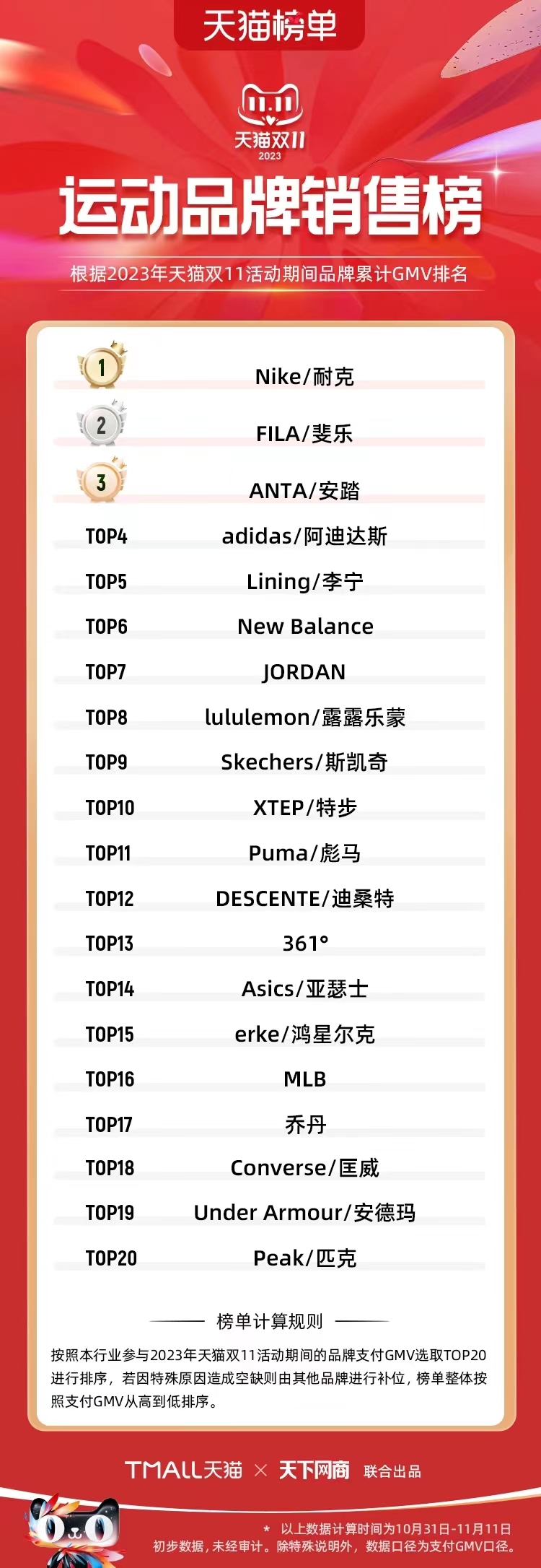在运动品牌中,耐克、斐乐(FILA)、安踏、阿迪达斯等运动品牌均收获了破亿销售额。