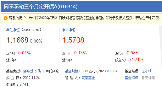 业绩排名第三的是同泰泰裕三个月定开债A,该产品成立于2022年11月24日,目前规模3.18亿元,不到一年的时间,该产品收益超过57%。