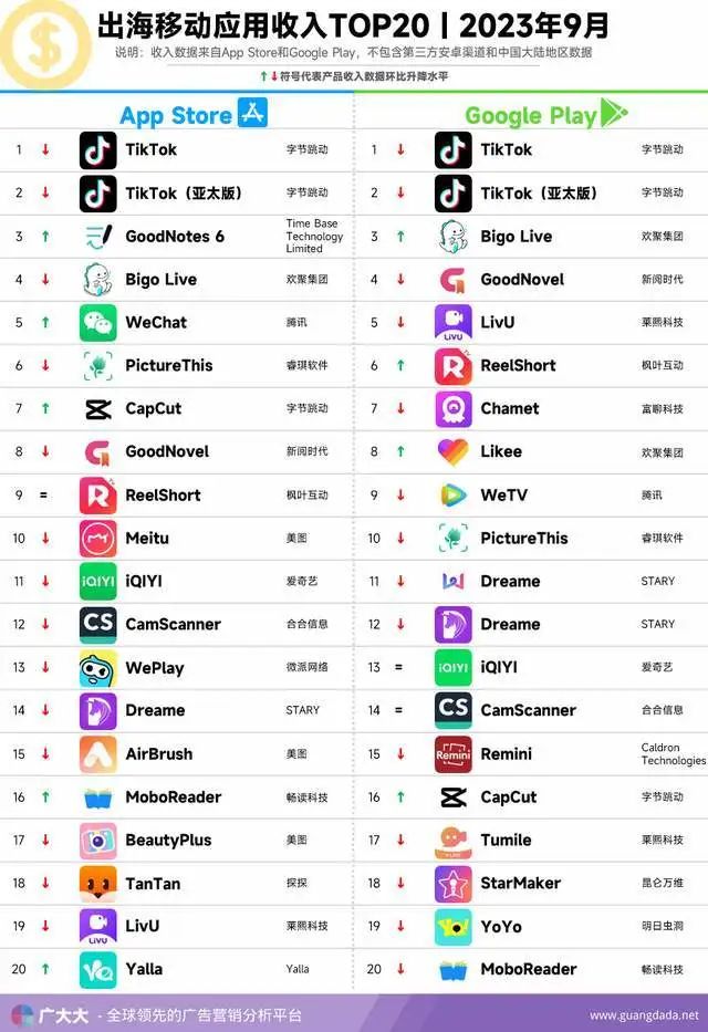 高成本带来了高回报,短剧市场也跑出了佼佼者。广大大数据显示,ReelShort在2023年7月的App Store与Google Play端营收已经超过了120万美元;到了今年九月份,ReelShort的Google Play营收上涨约40%,稳稳进入榜单前十,超过了WeTV、iQIYI。