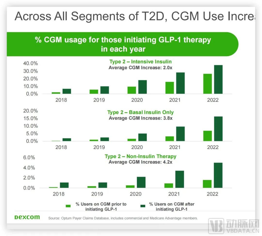 9月份,德康在其投资者大会上也公布了其一项基于Optum保险的研究,称强化胰岛素使用者在开始使用GLP-1药物后,CGM的使用量相比过去翻了一番,而基础胰岛素使用者和非胰岛素使用者在使用GLP-1药物后,CGM的使用量翻了近两番。