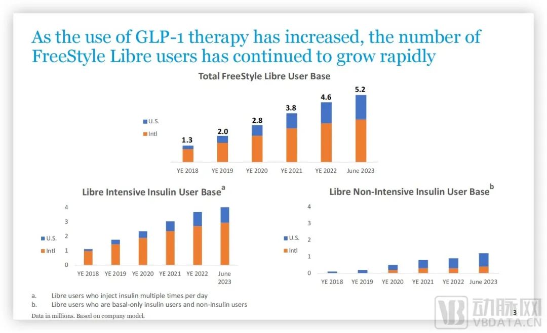 从雅培公布的数据来看,无论是在美国市场还是国际市场,随着GLP-1药物市场渗透率的增加,CGM用户也在快速增长。双方并没有形成非此即彼的局面,反而是共同上涨。此外,雅培统计了自身Freestyle Libre用户中使用GLP-1药物的占比,可以看到在雅培CGM用户群体中,GLP-1药物使用的比例也呈逐渐上涨趋势。