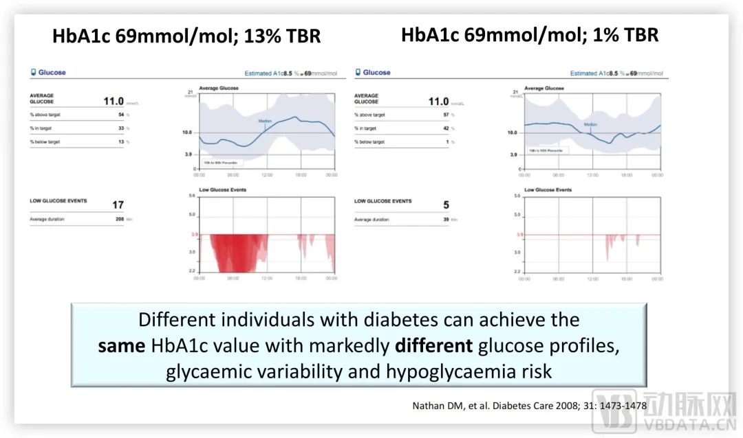 来自诺丁汉大学的Emma Wilmot教授指出,虽然HbA1c与微血管并发症呈正相关态势,是评价糖尿病并发症风险的有用指标,过往在临床上使用十分普遍,但不同糖尿病患者即使是相同的HbA1c水平,其血糖谱、血糖变异和低血糖风险也存在显著差异。HbA1c更多是反映过去一个时间段内的血糖水平而非即时血糖浓度,是一个相对粗糙的指标,它不能实时反映当前血糖水平,也无法显示血糖波动趋势、高低血糖预警以及具体控糖建议。