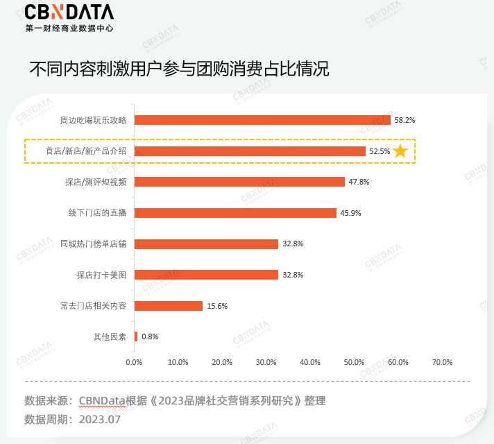 近两年,抖音的探店视频推流不断增加,与本地生活相关的团购以“低价”机制提高转化率。显然抖音试图用“内容+低价种草”的方式抢夺用户,但对于客单价低、社交属性强的茶饮品类而言,向“下”卷的通路已然非常拥挤,借内容向“外”破圈成为吸引新客的重要手段。《2023品牌社交营销系列研究》报告显示,52.5%的用户认为首店/新店/新产品的内容会刺激自己参与团购,从内容属性上看,“新鲜感”会刺激用户冲动下单,这也给一些新锐品牌带来了机会。