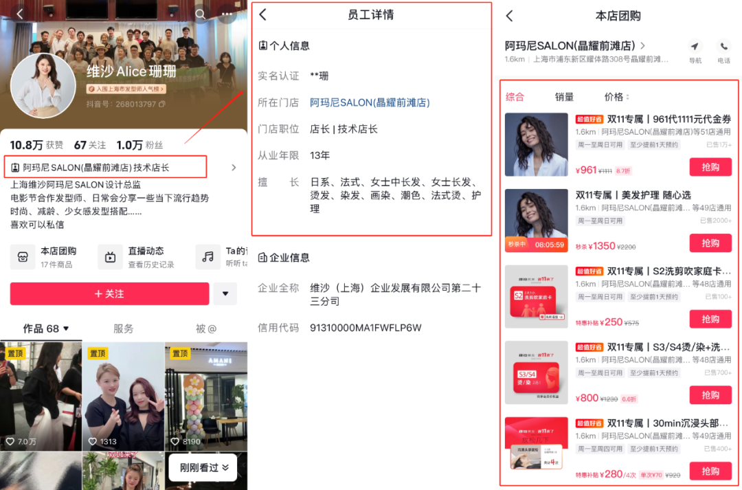 图片说明:职人账号首页有职人认证标签与所属品牌,商家也可绑定职人团购带货,图片来源:抖音团购截图