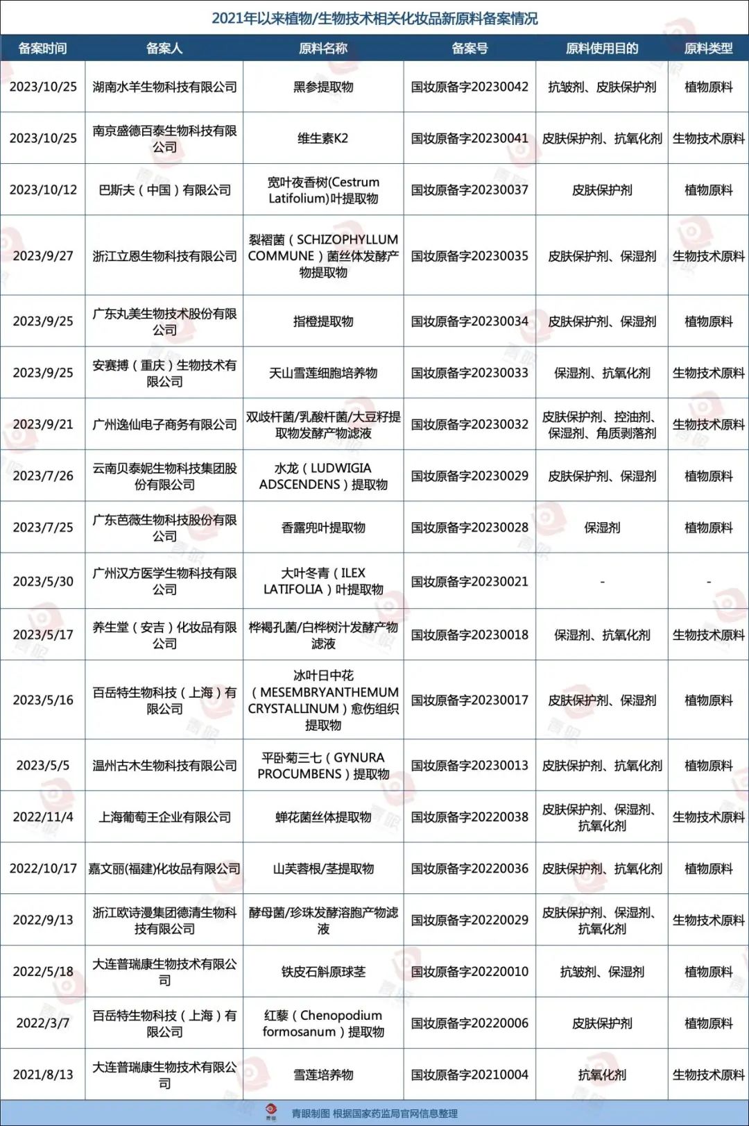 有原料企业负责人告诉青眼,相比于植物成分,单一成分的化学原料研发周期和成本可能会更长,再加上国内如中药、食品等行业都已经对植物类原料进行了很多深入研究,高校中也累积了不少基础研究成果,产业链更容易展开。而这,无疑也给植物成分新原料的注册备案,以及对旧原料的改良打下了产业和研发基础。