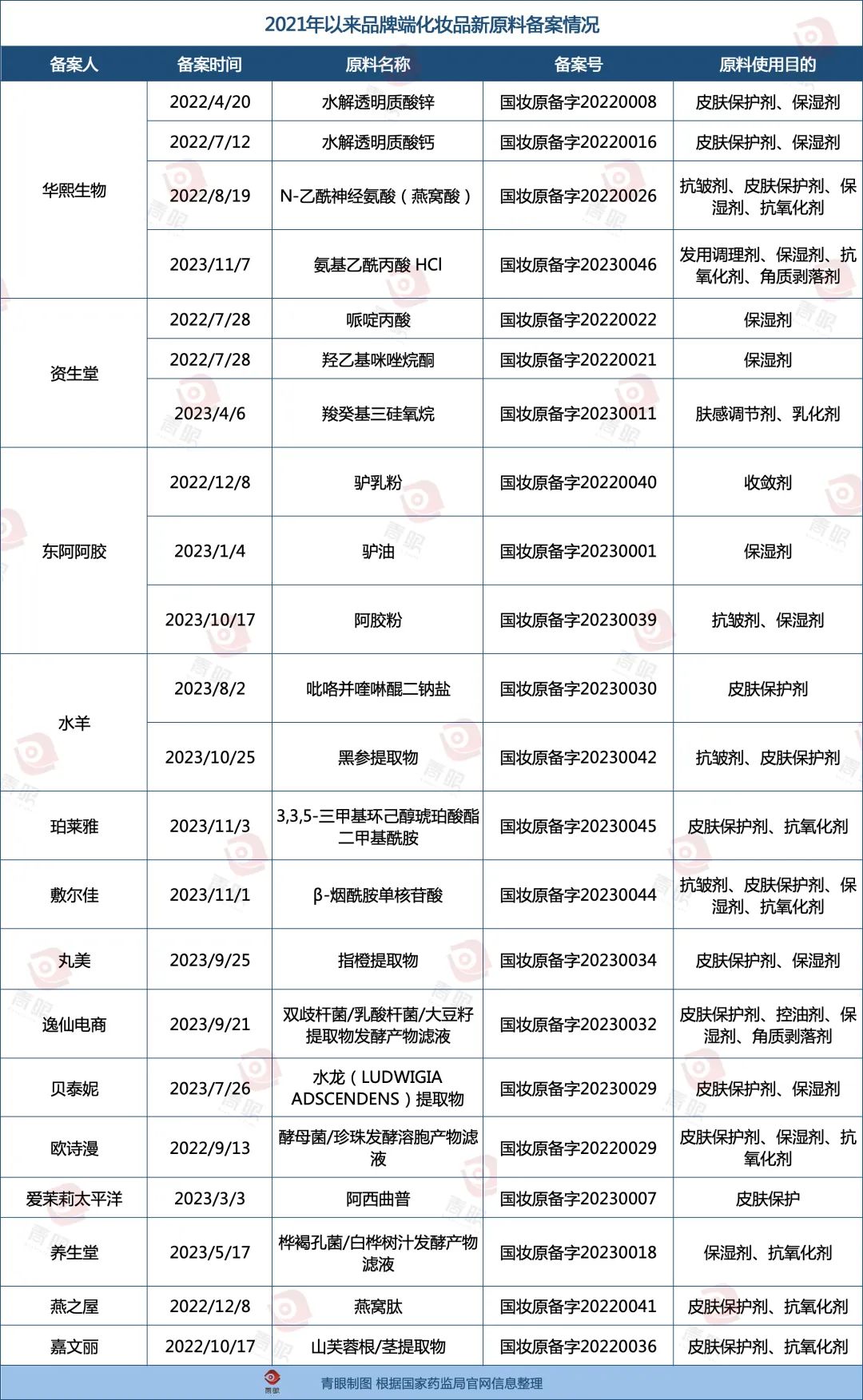 此外,有业内人士向青眼坦言,他认为政府对新原料的大力扶持,也容易造成许多企业为了备案而备案,原料做出来也不一定能够真正有效被应用于市场当中,比如关于驴油等新原料,在市场上的应用并不特别广泛,市场经济效益也并不明显。