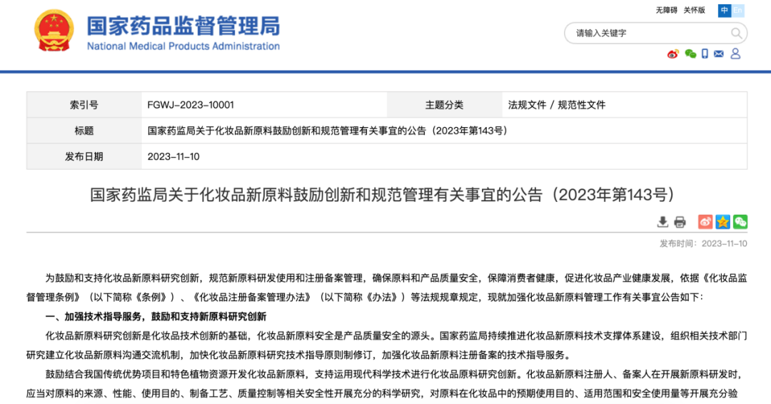 11月10日,国家药监局发布了关于化妆品新原料鼓励创新和规范管理有关事宜的公告,从三方面规范新原料研发和注册备案管理。值得一提的是,国家药监局在其中再次明确了新原料从备案、使用到监管的全链路责任归属,化妆品新原料的监管再次被收严。