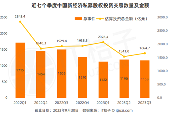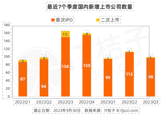 IT桔子数据显示,2023Q3合计有99家国内企业成功实现证券化,其中,仅有华虹半导体这家公司是二次上市;最近7个季度中,2022 年下半年的IPO行情较好,今年略微平淡。本季度首次IPO企业数环比减少了12%,同比下降了35%。
