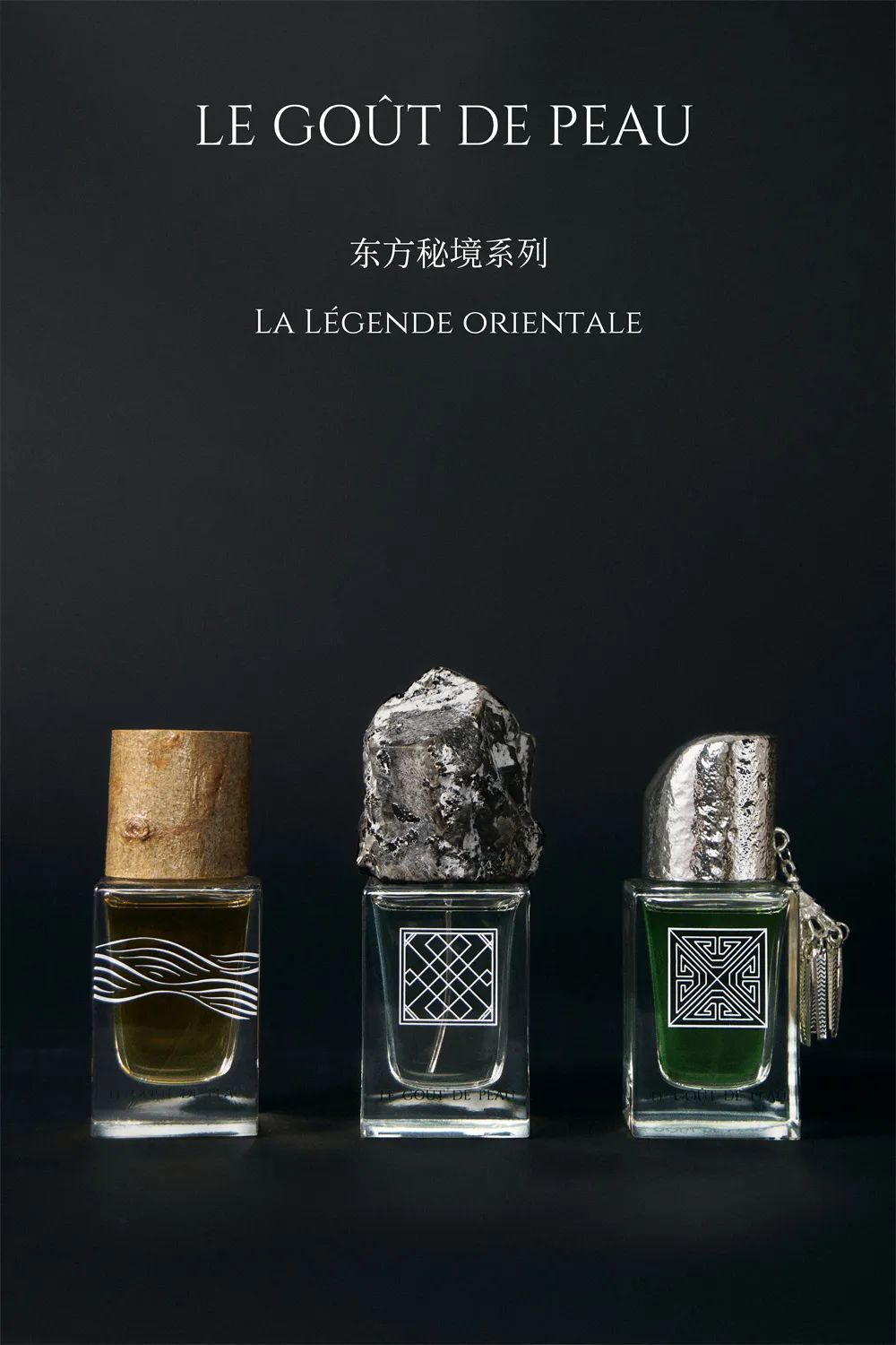 三瓶香水分别应用了不同的材质,沿着不同的设计方向出发,并且也包含了不同的文化根基。