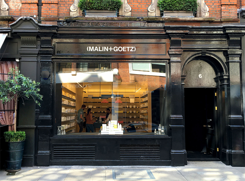 举例来说,美国护肤品牌MALIN+GOETZ(下文缩写为“MG”)遵循社区经营思路,每一家店铺也都有自己独立的风格,设计师在考虑店铺设计时,首要考虑的是店铺位置和周围环境,以求适应和融入当地。