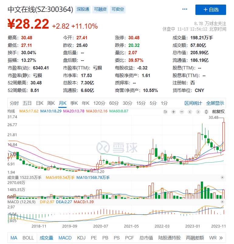 这次《完蛋》爆火的势头已经蔓延到二级市场。遥望科技、中文在线、掌阅科技、完美世界、华策影视、果麦文化等上市公司都以不同形式进入短剧行业,网文企业悉数入局,腾讯旗下的阅文集团也蠢蠢欲动,发布剧本征集令。在这其中受益良多的是中文在线,股价一度从 12 元左右暴涨到超 30 元,创下公司历史最高。而当前一款大热的短剧 App 河马剧场开发商为中广电传媒,A 股上市公司天威视讯持有其 26.17% 股份。受此影响,天威视讯连续 5 个交易日涨停。