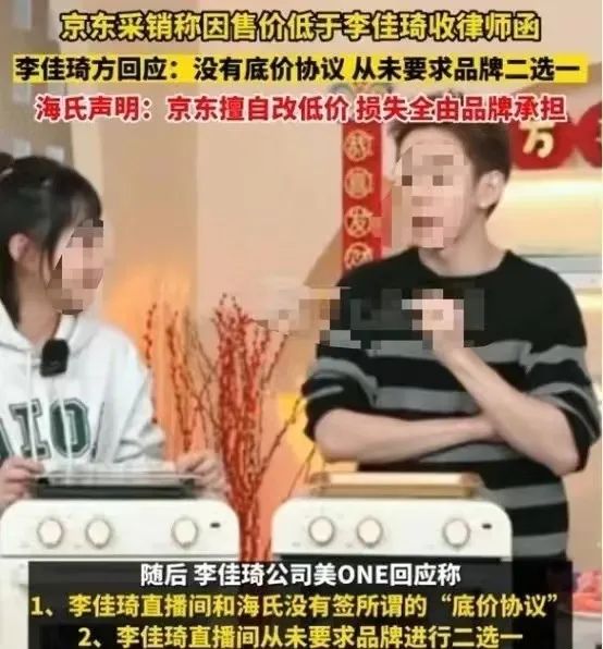 随后京东集团副总裁、京东家电家居事业部负责人李帅再发朋友圈,直言“某些头部主播为了一己私利,剥夺消费者享受真低价权益”,要求抵制“全网底价”协议和霸王条款。表面上是海氏与京东的纠纷,实则矛头指向的是李佳琦和“底价协议”。