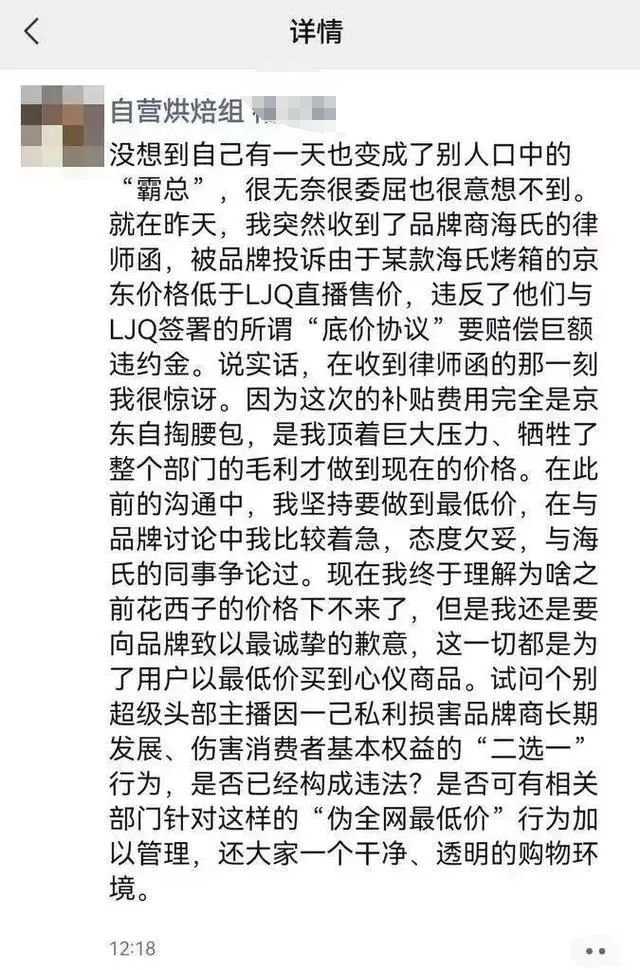 10月24日下午,“京东采销喊话李佳琦”登上微博热搜,起因是一位京东采销人员的朋友圈。他收到品牌商海氏的律师函,被投诉某款烤箱的京东售价低于李佳琦的直播售价,违反了他们与李佳琦签署的所谓“底价协议”,要赔偿巨额违约金。
