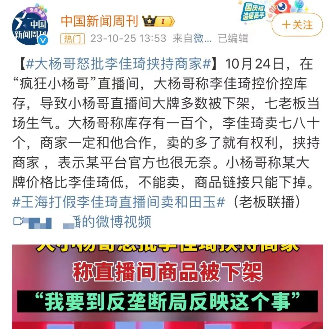 先是京东采销工作人员的朋友圈截图率先开炮,指责李佳琦对品牌方控价,侵害消费者权益;再是抖音头部主播“疯狂小杨哥”跟进,不满“货都被他拿走了”;加上打假和近日曝出的美ONE选品团队贪腐案件……自从“哪里贵了”之后,围绕在李佳琦周围的质疑浪潮一浪接一浪。