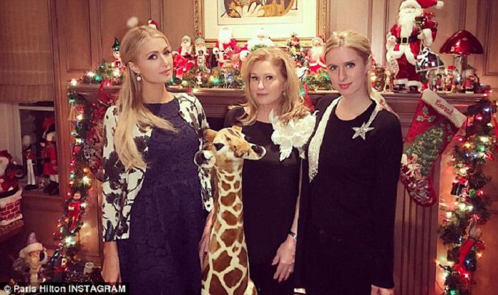 身为商业女性的希尔顿继续贴出了几张自己与母亲及电视名人金·理查兹和拉托亚·杰克逊等人的合照,希尔顿身穿黑色长袍搭配白色夹克欢度圣诞节,她的长发搭在肩膀后侧。在另一张照片中,希尔顿和自己的母亲及妹妹一道站在一个长颈鹿玩偶前合影留念。