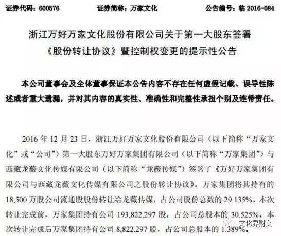 北京时间12月26日晚,A股上市公司万家文化公告显示:公司最大股东万家集团将持有的1.85亿股股份转让给西藏龙薇文化传媒(以下简称龙薇传媒),转让股份占公司股份总数的29.135%,作价约30.6亿元人民币。