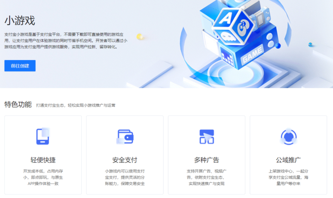 根据官方介绍,支付宝目前有官方小游戏平台“游戏中心”,可在支付宝各个流量入口帮助小游戏商家吸引用户,提供内购和媒体主等功能吸引游戏用户付费及消费广告,并逐步开放订阅消息,收藏,搜索等产品,帮助商家提高获客、转化、留存、召回等环节的效率。