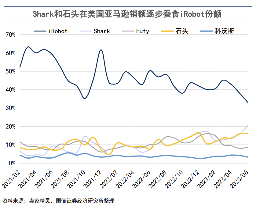 2020年之前,科沃斯好不容易挤进北美市场前三,市场份额只有3%。2021年以来,石头科技开始在线上渠道崭露头角,根据国信证券2023月6月的数据,石头科技以15%以上的份额进入美国亚马逊扫地机第三名;科沃斯在美国亚马逊的份额变化不大,还在5%以下。
