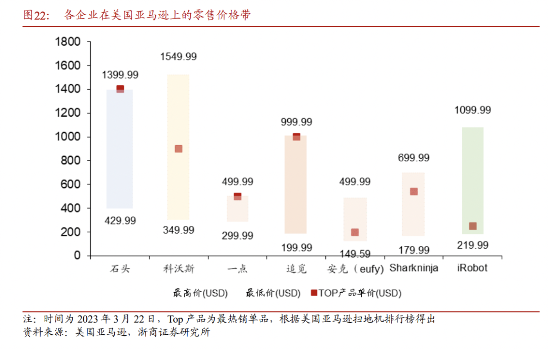 科沃斯们出海后,也坚持走高端路线,比扫地机器人全球老大iRobot(2020年全球市场份额为46%)卖得更贵。以美国亚马逊平台上的价格为例,科沃斯、石头科技的爆品价位段分别是800美元以上、1400美元左右,明显高于iRobot。iRobot的最热单品售价约250美元。