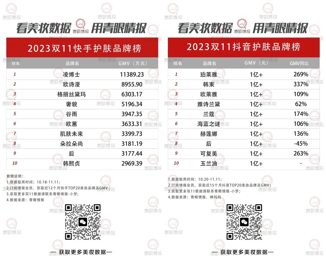 青眼情报数据显示,抖音平台双11 GMV排名前10的品牌中,仅有YSL、3CE两个外资品牌,其余均被国货占据。包括彩棠、方里、AKF、柏瑞美、柳木丝在内的9个品牌增幅都超过100%,FV增幅甚至破3000%。