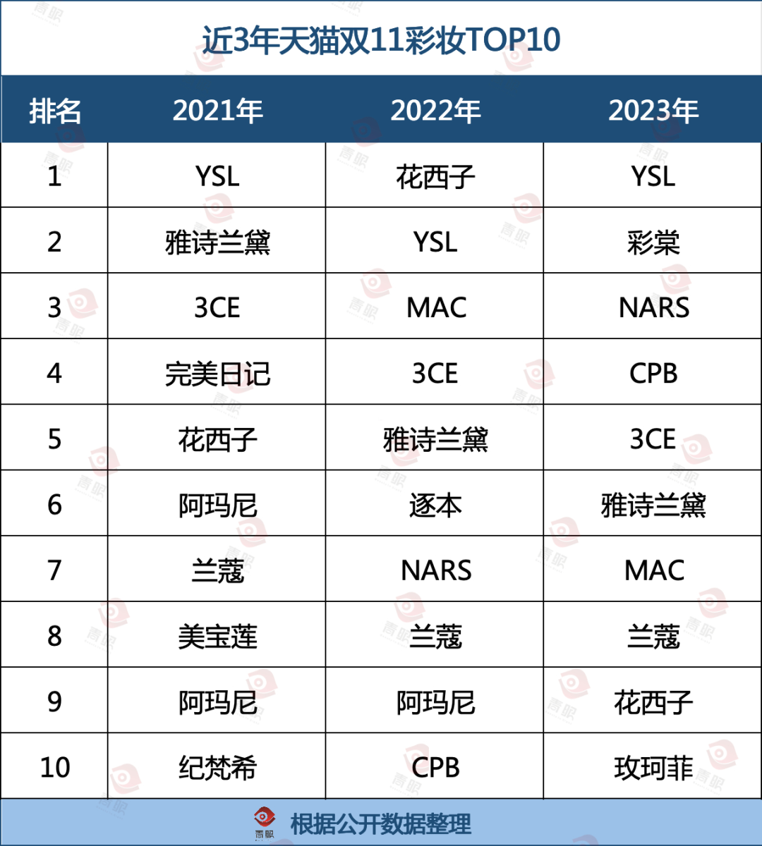 从近11年天猫双11美妆榜来看,国货品牌与外资品牌的争夺赛从未停歇,而上榜品牌以及哪些品牌能拔得头筹,也在一定程度上反映了当时的行业面貌。