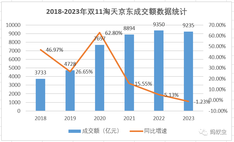 此时,换了有些作者可能就会写:一个XXX的时代结束了。不过我还是平淡地记叙:在15岁的年头,双11结结实实地撞上了天花板,增长戛然而止!