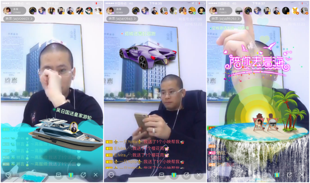 12月22日晚上,冉大人开播。只是,这次坐在直播间的不是她,而是思埠集团(国内最大的微商化妆品公司)合伙人、映客ID为“等等”的主播。直播地点就在广州思埠办公室。等等在直播间大声吆喝,让大家关注一下自己、孤城、吴召国等人。而从开播到结束,孤城、吴召国一直在刷礼物就没有停过,一个皇家游轮折合人民币1314元,一个岛折合人民币3344元,他们一直在制造礼物满屏的盛况。