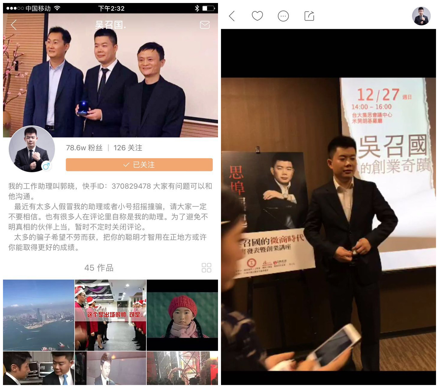除了映客平台,吴召国还尝试了快手。他的快手个人主页,用他与马云、马化腾合影当封面,发布了45个短视频。短视频的内容,要么是他与名人在一起,要么就是如何加入思埠创业致富。他曾表示,快手红人二驴、小宝、老方丈等都已经成为思埠代理商。