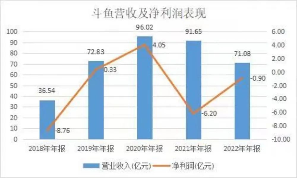 根据斗鱼年报数据,斗鱼在2020至2022的3年时间里,营收规模分别为96亿元、91亿元、71亿元,斗鱼已经3年连续处于下滑轨道。纵观斗鱼的净利润,结果也不理想。2020年斗鱼净利润为5.4亿元;2021年,净亏损达6.2亿元;2022年亏损收窄为9040万元。其中,2022年,斗鱼的盈利转为净亏损,广告业务收入也明显下滑。