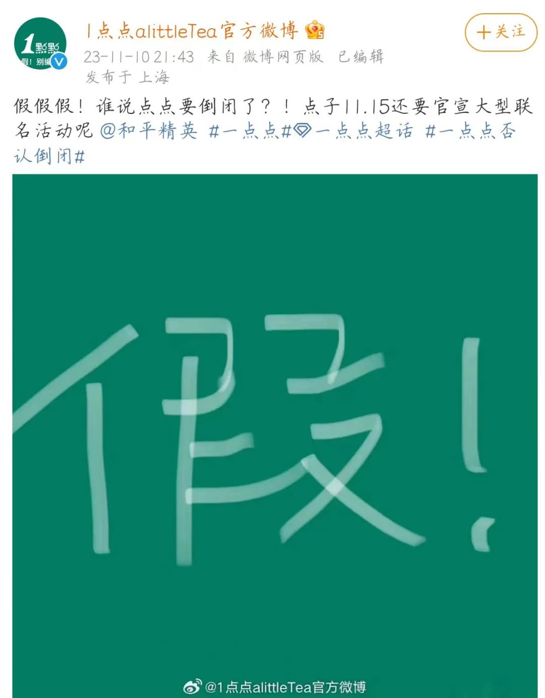 眼看话题热度越来越高,11月10日晚,1点点连夜在微博发文否认倒闭:“假假假!谁说点点要倒闭了?!点子11.15还要官宣大型联名活动呢。”