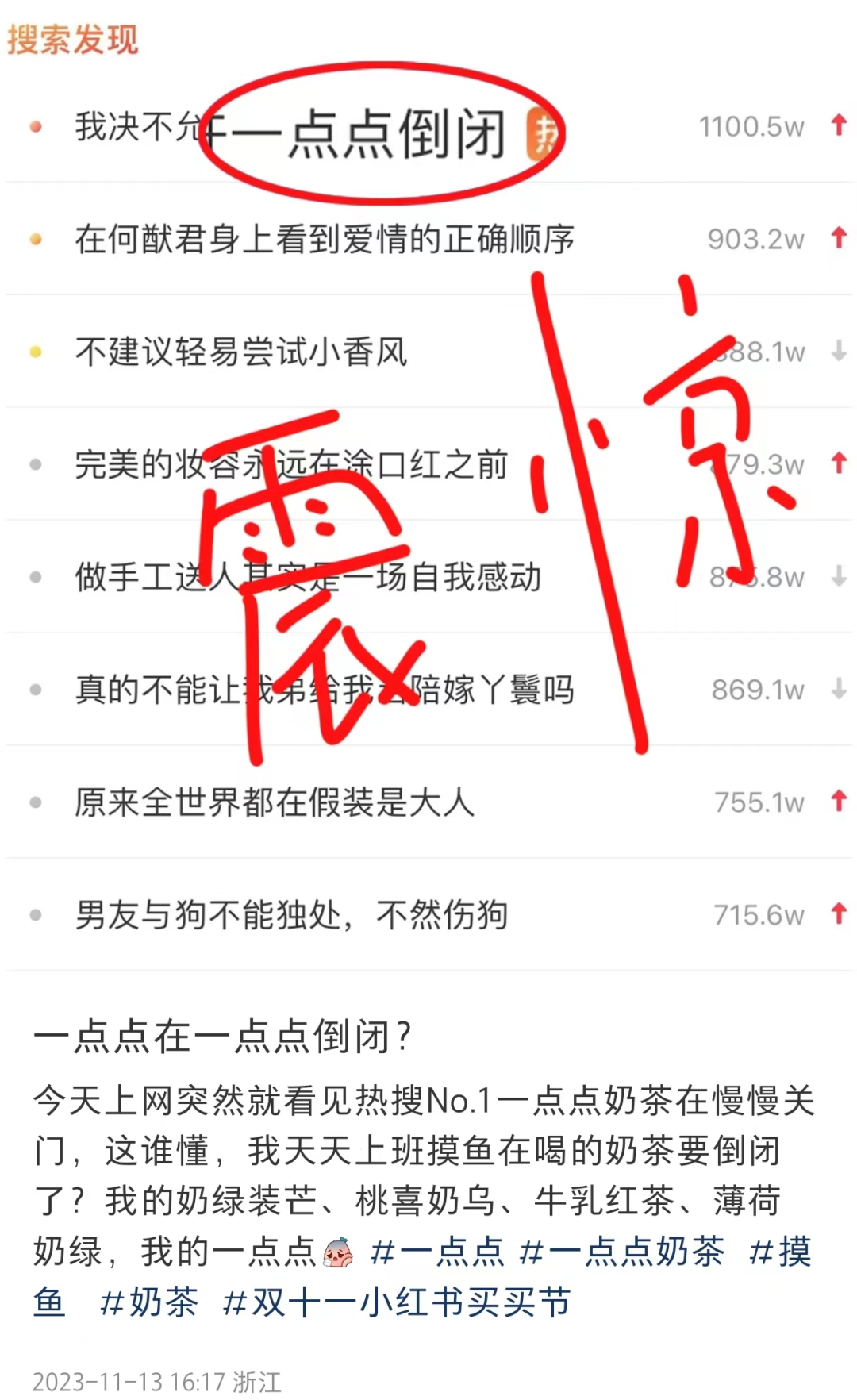 - 11月4日,#感觉“一点点”慢慢退出奶茶届了#登上小红书热搜排行榜第一,关注度1100万+。