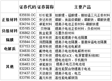 锂离子电池主要由正极材料、负极材料、电解液和隔膜等四个主要部分组成。负极材料以石墨、固体碳为主,负极材料约占锂离子电池中成本的 10%-15%。正极材料主要由含锂的过渡金属氧化物,常用的材料有钴酸锂、锰酸锂、三元材料和磷酸铁锂等,正极材料约占锂离子电池成本的 30%-40%。电解液占到锂离子电池成本的比例为10%-15%,隔膜为20%-30%。目前新三板关于锂离子电池行业的公司超过50家,以锂离子电池四大组成部分以及2015年净利润超过2000万筛选出15家公司,如下表所示。需要说明的是,涉及隔膜的纽米科技、鸿图隔膜和涉及电解质的诺邦科技、氟特电池财务指标上不符合条件,但是为了保持完整性,仍列示在表中。