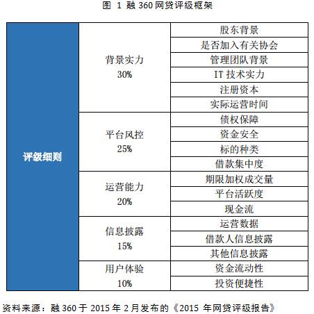 回头看看融360的评级,从披露信息看,融360的网贷评级共包括5个大项合计18个小项,每个小项又对应若干可量化或不可量化的指标。如考察股东背景,主要根据平台是否有银行、国资、上市公司背景及是否获得风险投资等非量化指标进行评估,而平台活跃度一项,则主要通过平台借款人数、投资人数、平均满标时间等可量化指标进行考察。